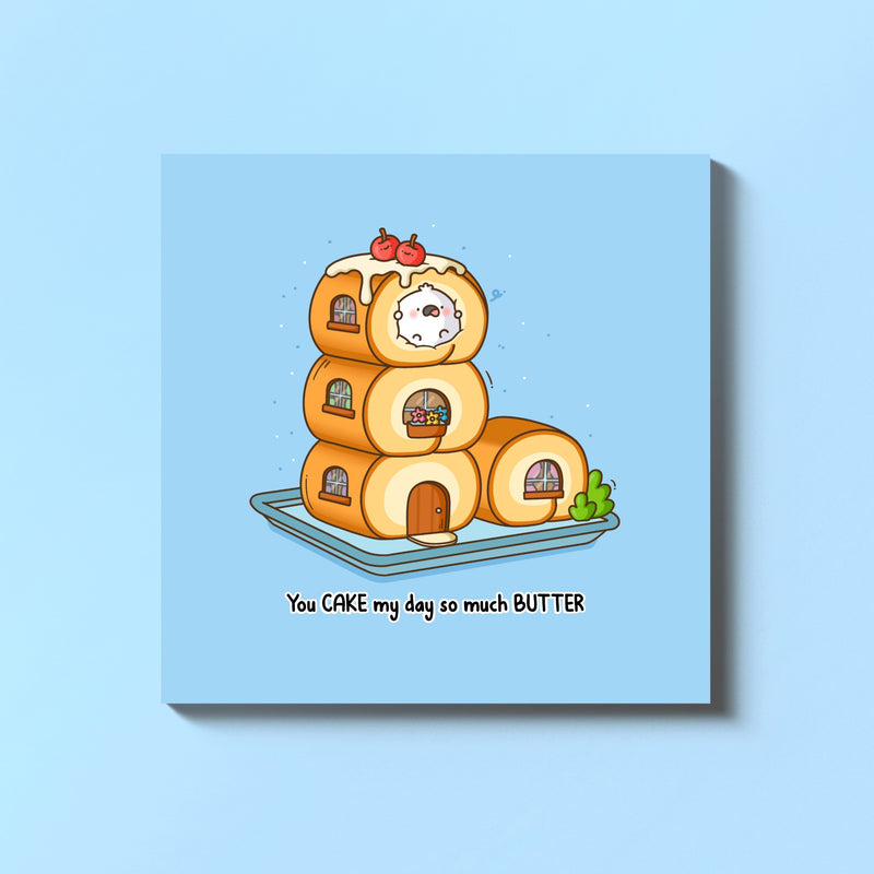 Look closely and you’ll spot a little character stuck in the cream swirl on the top floor - because love (and cake) can be a bit messy sometimes. The pun “You Cake My Day So Much Butter” adds the perfect dollop of charm, warmth, and whimsy - ideal for thanking someone who fills your life with joy, laughter, and buttercream goodness.