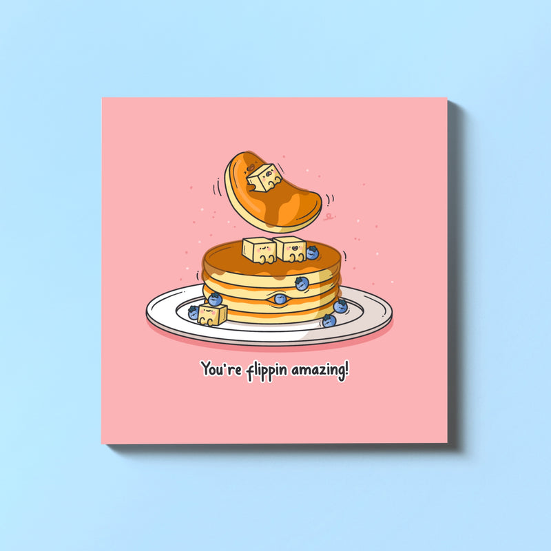 Send someone a big ol' stack of appreciation with this breakfast-inspired pun card that’s flippin’ full of joy! This cheerful design features a stack of golden pancakes dripping with syrup and dotted with juicy blueberries, but the real magic is in the mischief: one pancake has flipped clean off the stack, soaring through the air while clinging tightly to a very nervous butter cube. Below, two other happy butter blocks are lounging on the top of the syrupy pile like it’s their spa day. The scene is warm, whimsical, and guaranteed to make someone smile. Whether you’re celebrating a big win, cheering up a friend, or just want to say “you’re amazing” in the most buttery way possible, this card delivers a sweet and silly moment worth savouring. Inside, you’ll find a charming pancake-themed print and one blank side for your note. It’s the ultimate way to dish out some joy - with plenty of syrupy love.