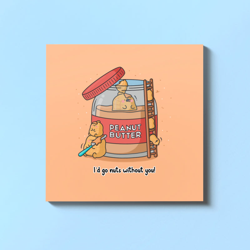 Delight someone special with our charming peanut butter greeting card! This whimsical design showcases a cute peanut trapped in a massive jar of peanut butter, while tiny peanuts bravely scale a ladder to save their friend. The heartfelt message on the card reads, 'I'd go nuts without you.' If you're looking to share your heartfelt sentiments with a loved one, this card's fun design makes it the perfect pick, especially for those who adore peanut butter. Let this charming card be the vessel for your heartfelt wishes, and watch as it brightens someone's day with its delightful appeal.