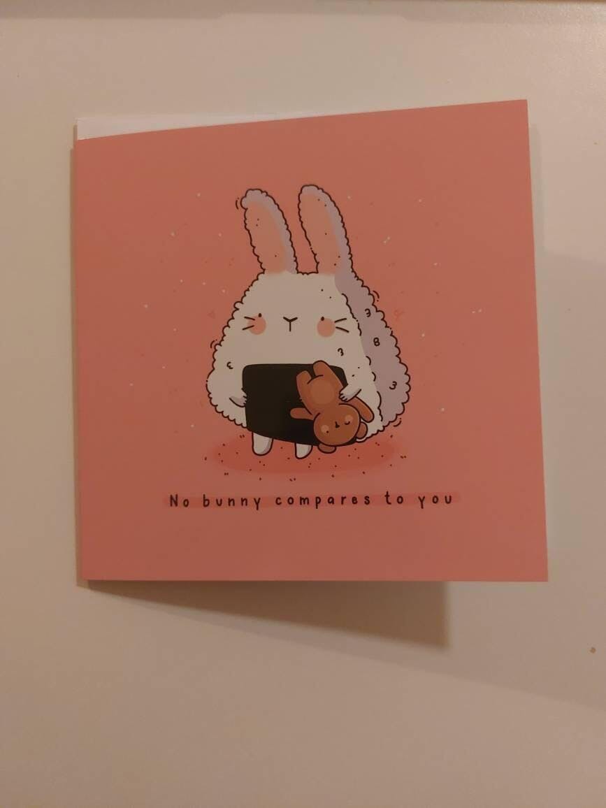 Paired with the pun “No bunny compares to you,” this card is the ultimate way to show affection - whether it’s for a friend, partner, or anyone who fills your heart with joy and your soul with soy sauce-level comfort. Sweet, silly, and soul-warming - this is a card that hugs with every glance.